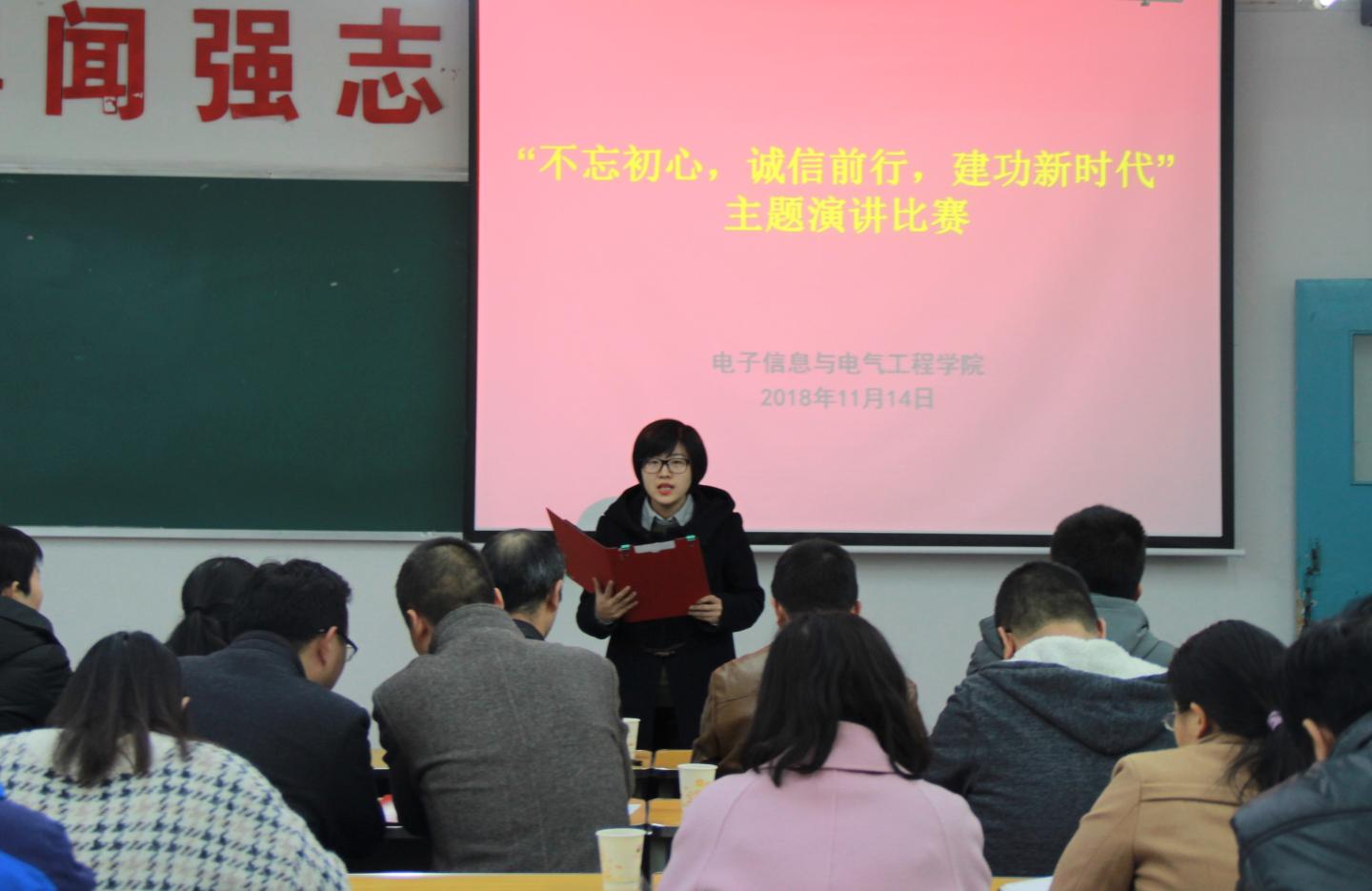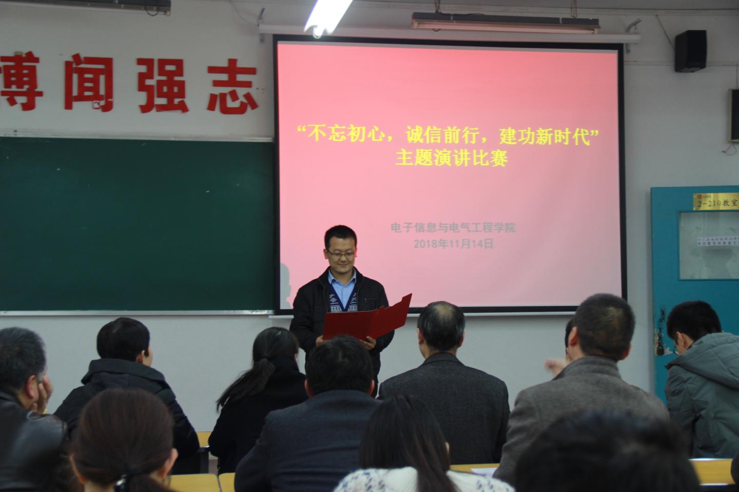 接着,按照抽签顺序,参赛选手陆续登场,他们潇洒的仪态,动人的嗓音,深情而精彩的演讲,赢得了观众的阵阵热烈的掌声。演讲者从生活小事谈起,引经据典,以身作则,阐述了对诚信的理解,以及如何守信。守信,守住的不仅仅是人与人之间的信任,更是心与心之间的交流。在座的评委们客观公正的为每位参赛者打分,最终陈倩获得一等奖,刘俊、沈光美分别获得二等奖任艳、楚冰清、张鑫获得三等奖,唐龙龙获得优秀奖。