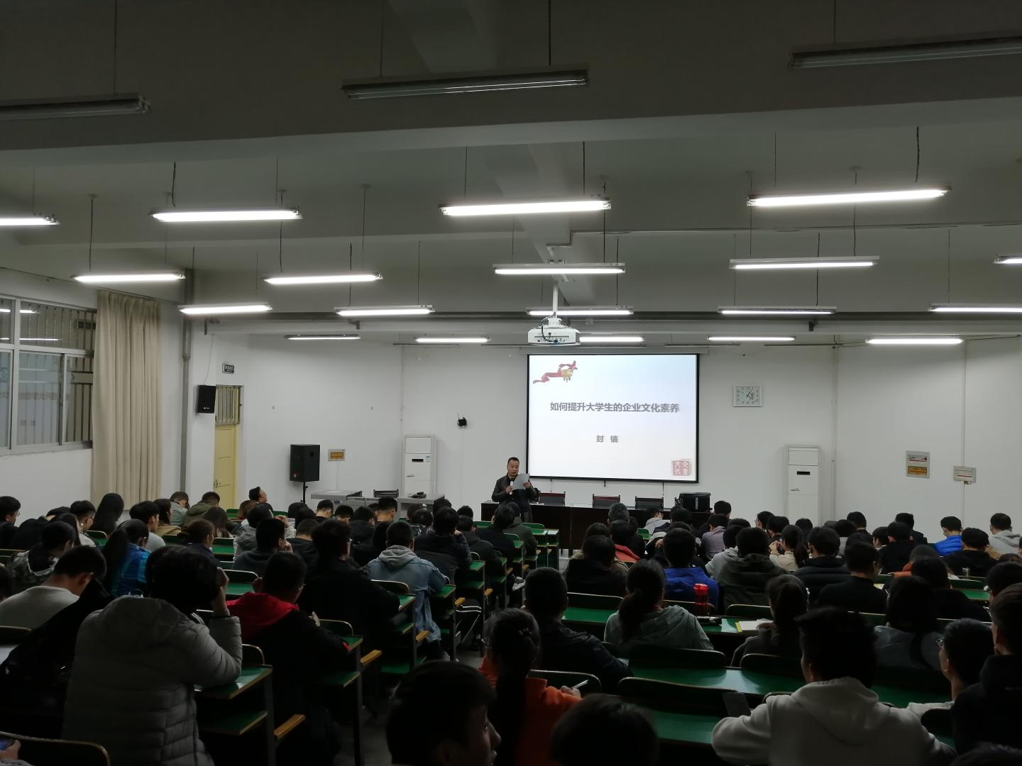 封镇老师围绕“什么是文化”、“什么是企业文化”、“提升企业文化的几点建议”为纲,展开自己对文化、企业文化的理解。在报告中,他引经据典、讲解关于中国传统文化的诗词,引导同学们对文化、企业文化的深刻认识。在报告结束之际,他衷心祝愿同学们学好坚实的专业理论基础知识、练好强硬专业技能技术,不断提升自己在文化方面的才能,在自己人生实践中,为社会做出更多贡献。